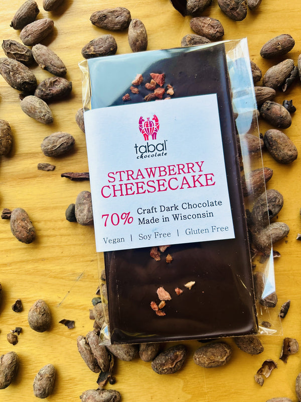 Ingredients: Organically and sustainably grown single source cacao, organic cane sugar, freeze dried strawberries, cheesecake oil.